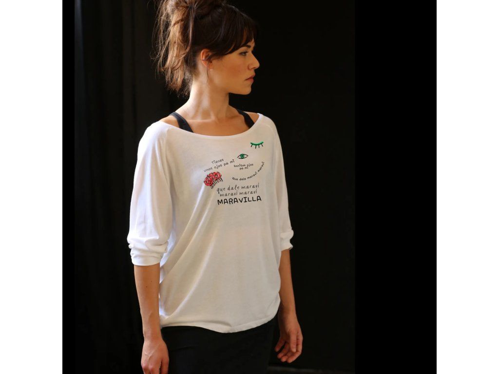 Pohodlné stylové tričko značky FLAMENCOLOGY s flamenkovými nápisy a 3/4 rukávy vhodné na tréninky i na běžné nošení.