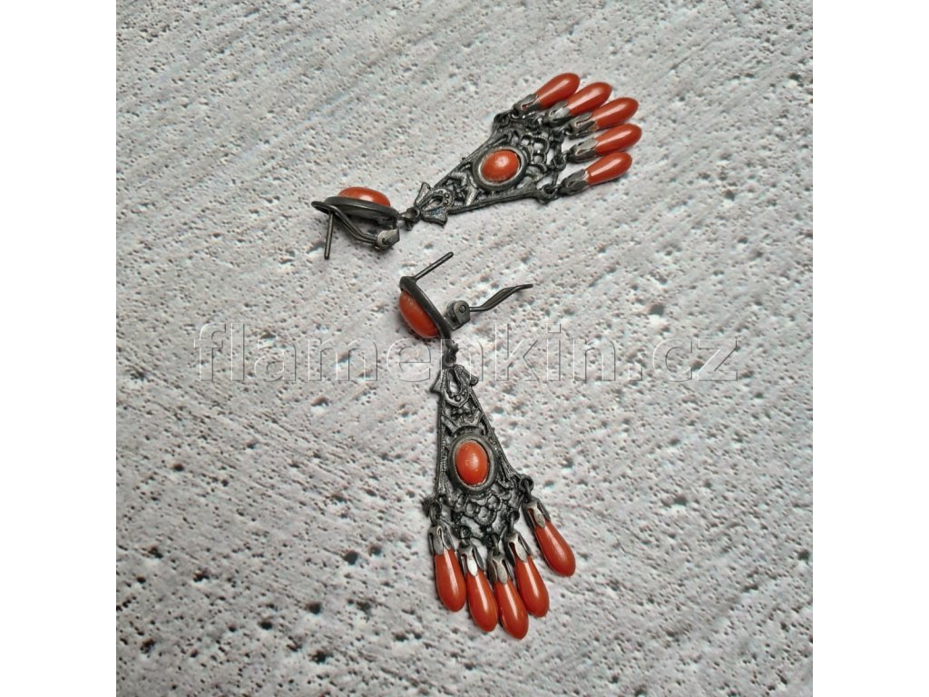 Výrazné kombinované flamenkové náušnice z kovu a imitace korálu.