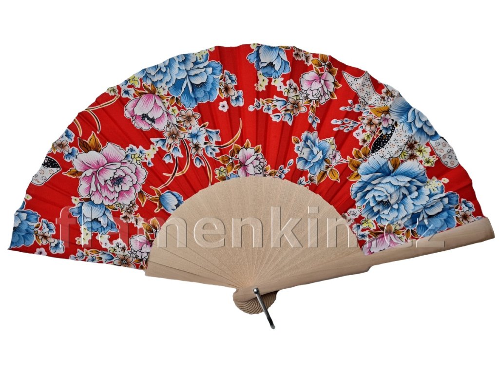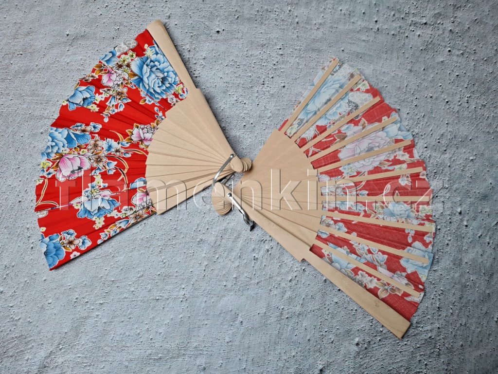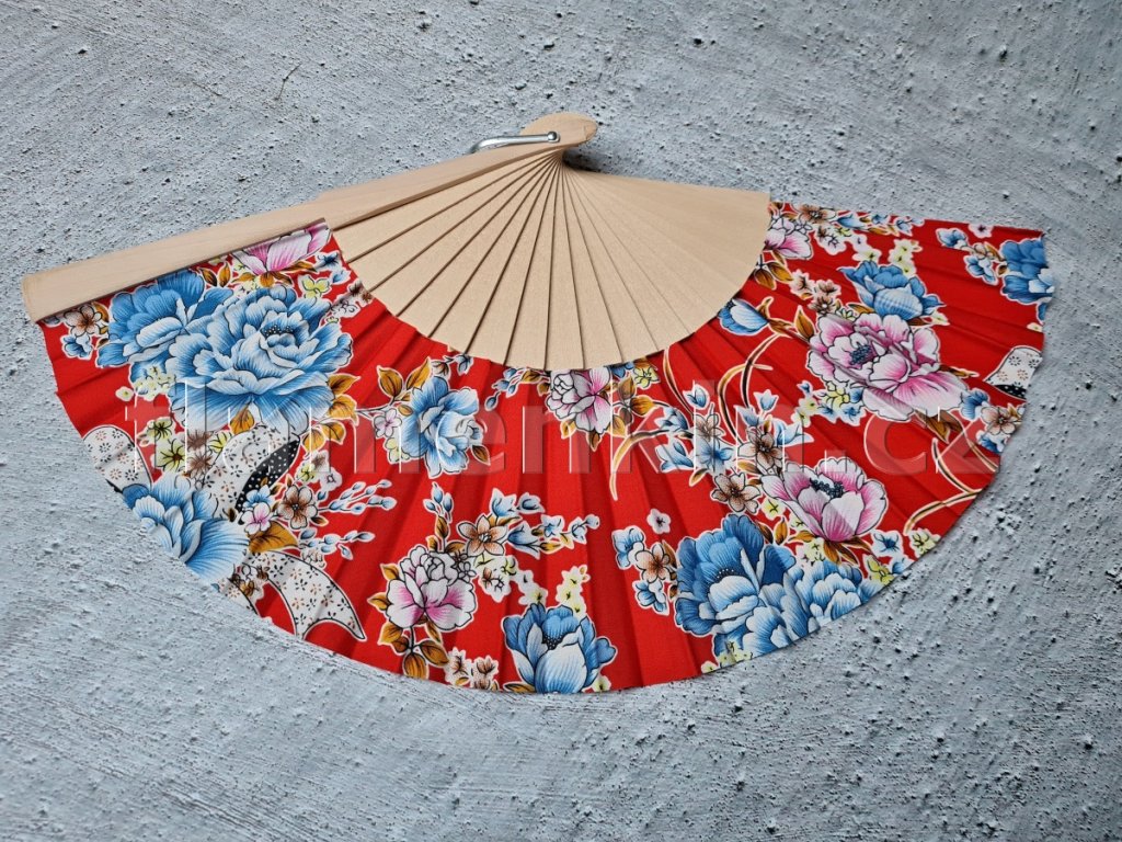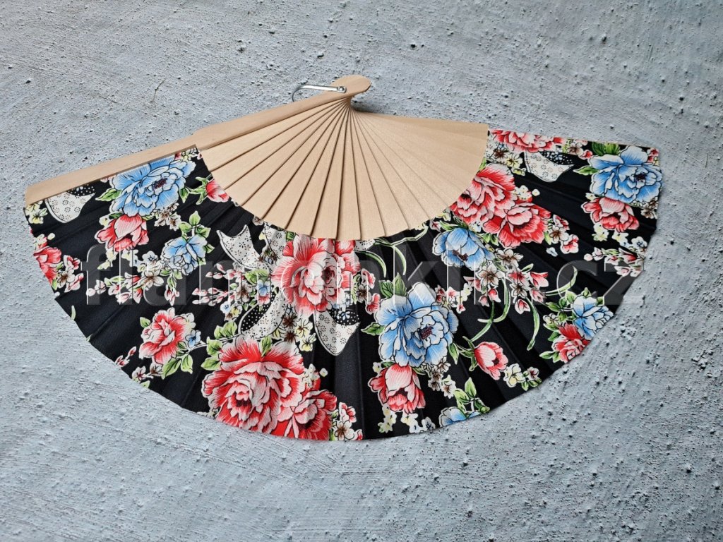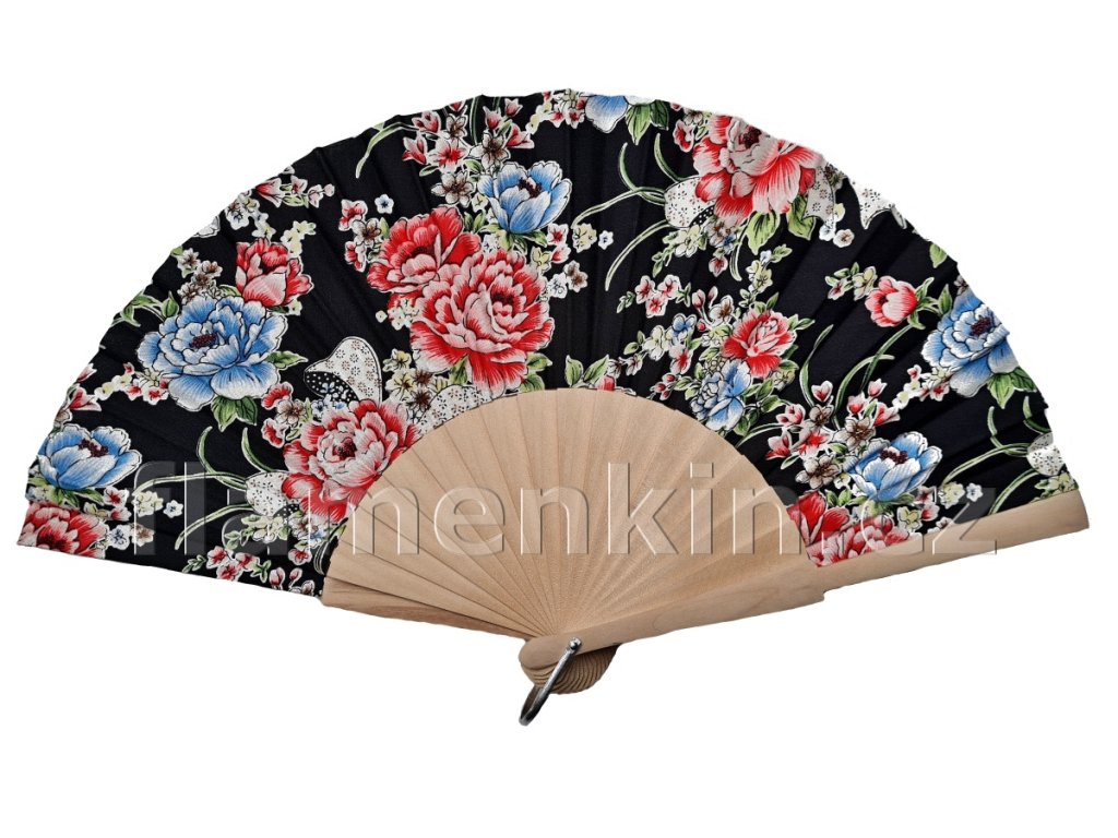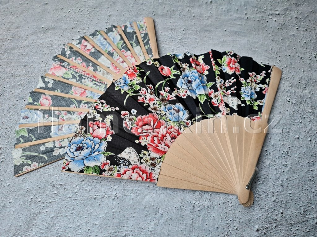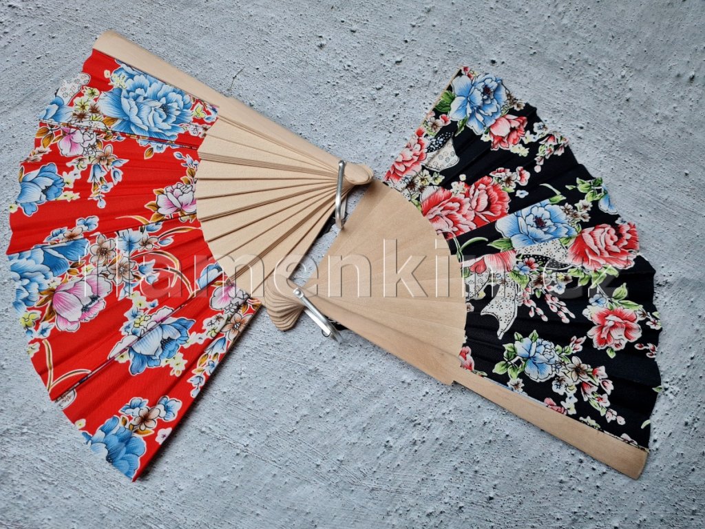 Malý hladký skládací vějíř s krycí boční lištou o délce 23 cm, zdobený látkou s jednostranným potiskem.