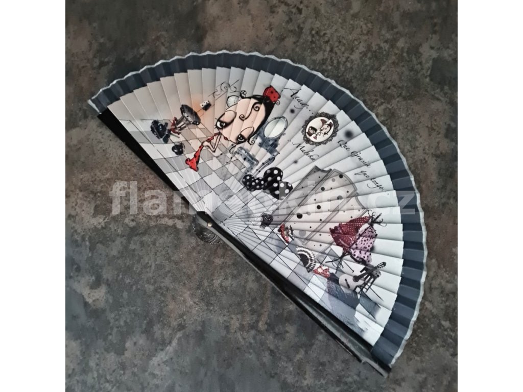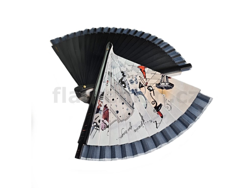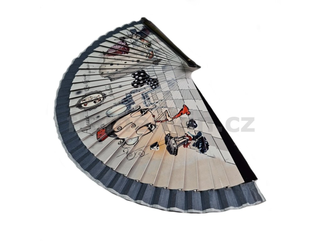 Malý hladký jednostranně malovaný skládací vějíř s krycí boční lištou o délce 23 cm.