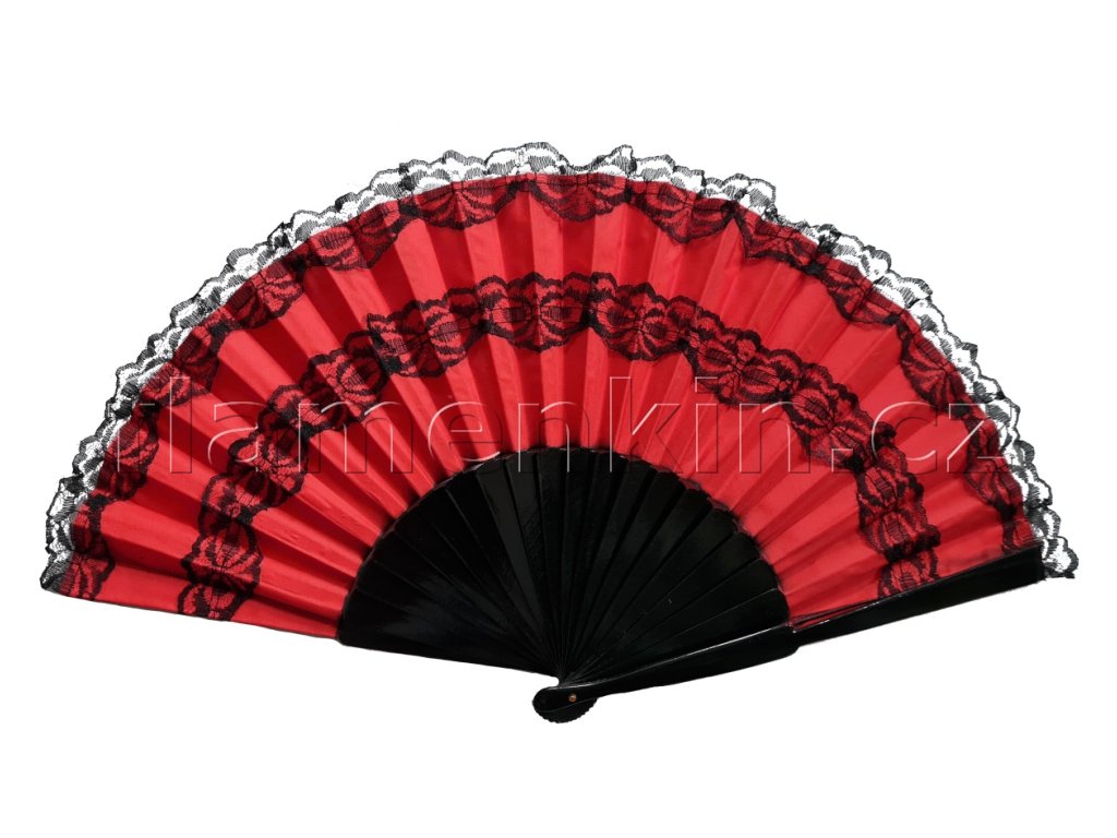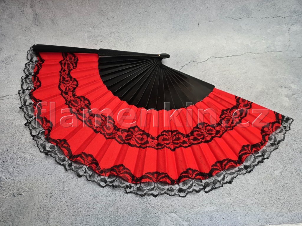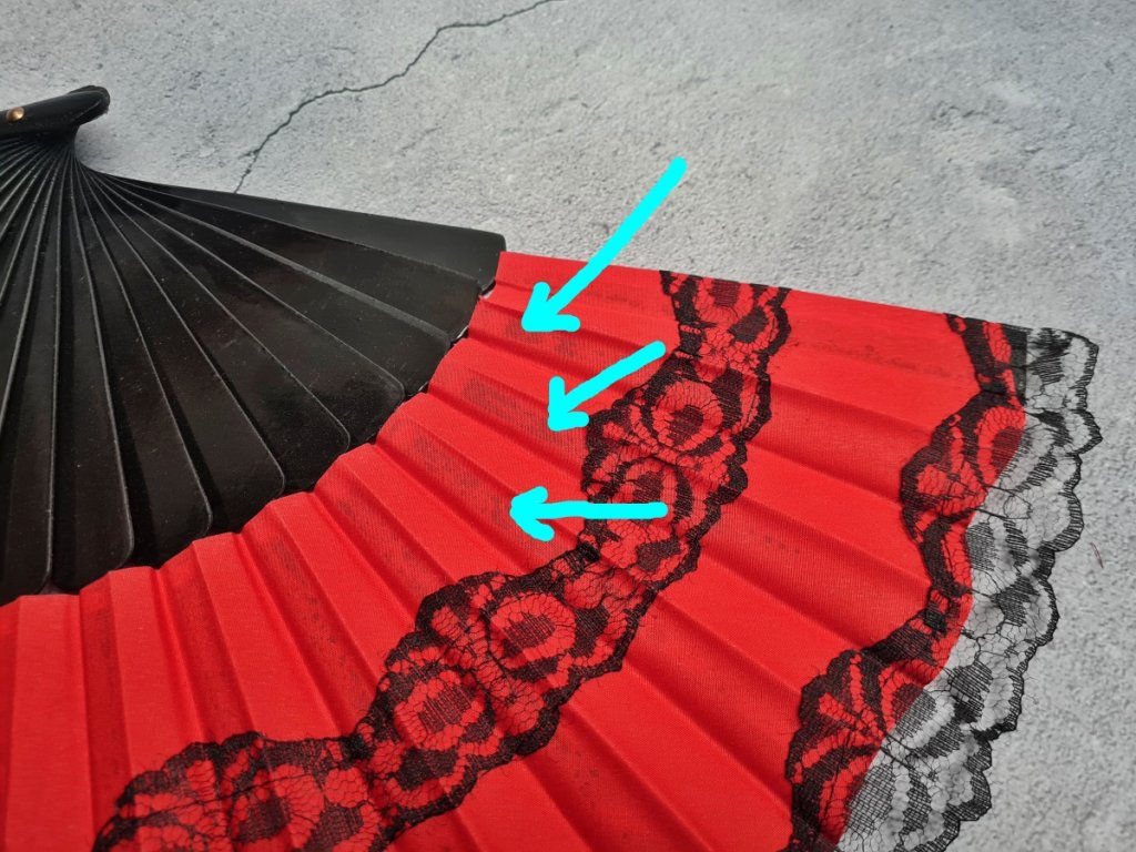 Velký skládací vějíř (ve španělštině zvaný pericón) s lehce prosvítajícími skvrnami lepidla na většině lamel na lícové straně vějíře.