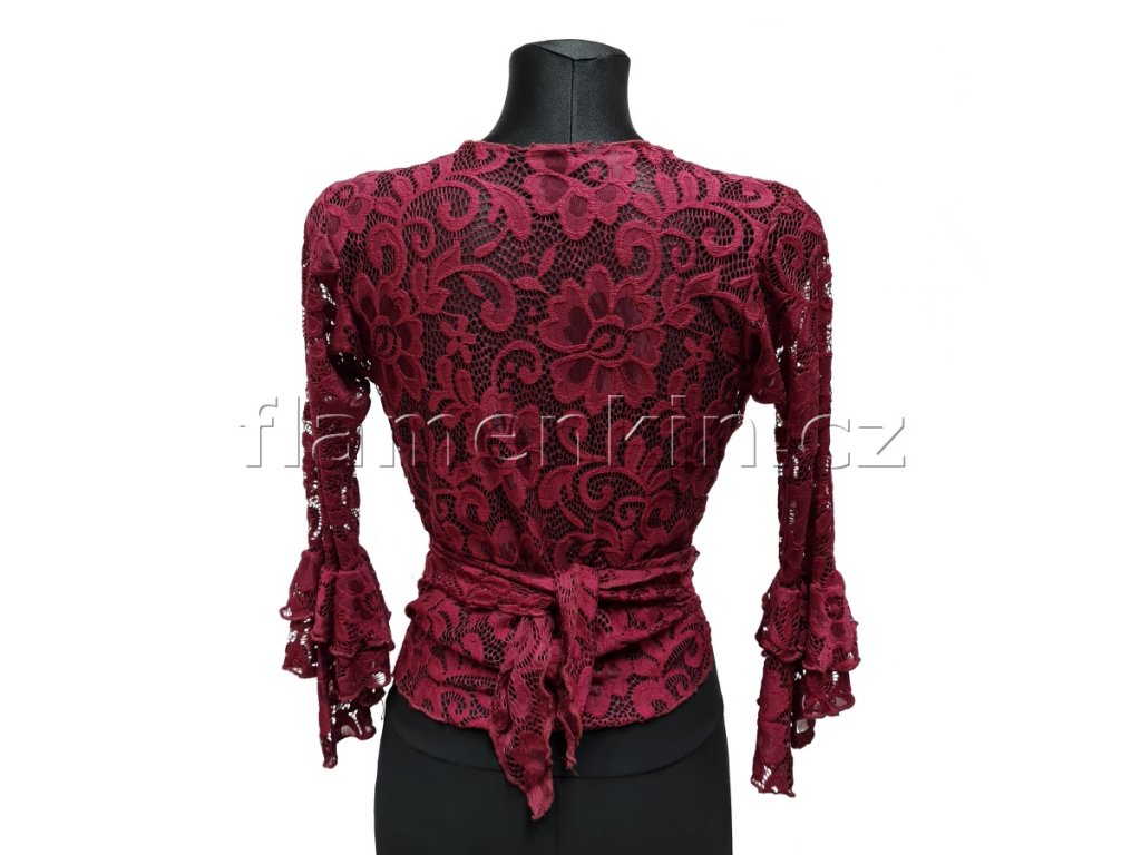 Jednobarevný zavazovací vršek z příjemného, pružného a přiléhavého materiálu s 3/4 rukávy, zakončený dvěma volánky.