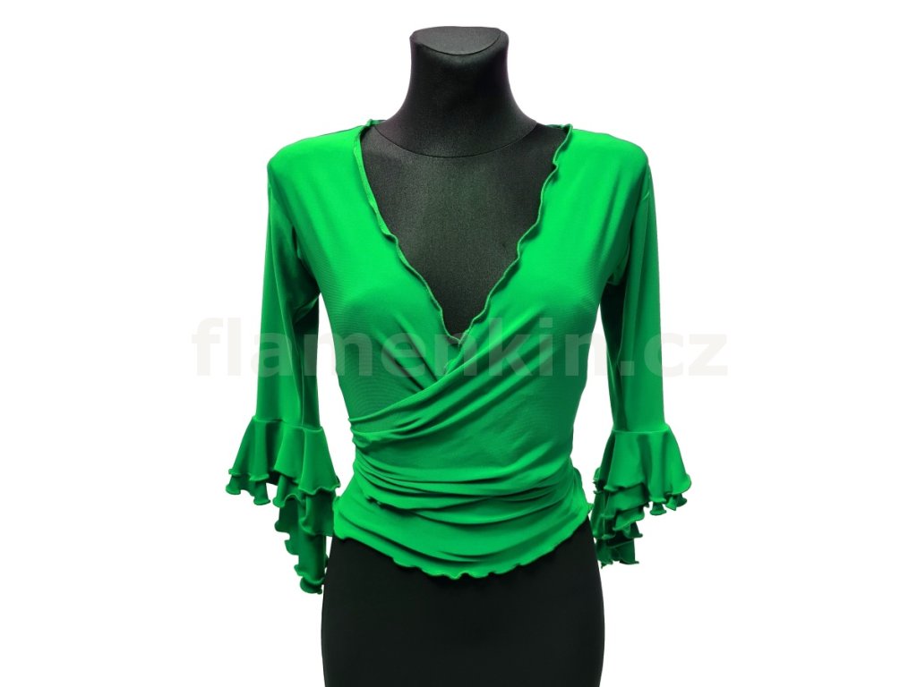 Jednobarevný zavazovací vršek z příjemného, pružného a přiléhavého materiálu s 3/4 rukávy, zakončenými dvěma volánky.
